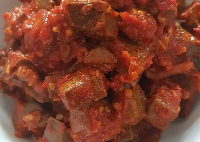 Ambil 1/5 hati sapi /mbe. Gunakan 10 bh cabe keriting bisa plus cabe orange sesuai selera pedas. Sediakan 5 bh bawang merah. Gunakan Secukupnya garam. Gunakan penyedap. Gunakan kecap. Sediakan minyak. Gunakan 4 lbr daun salam.Cara membuat sambal goreng ati SAPI Sambal Goreng Ati Sapi adalah masakan tradisional yang bisa dipadukan dengan beragam hidangan lainnya. Rasanya kurang seru memang kalau sederet masakan rumahan yang tersaji di meja makan tidak didampingi oleh Sambal Goreng Ati Sapi yang tenar. Setelah ati sapi matang, tunggu hingga dingin barulah kemudian potong-potong ati sapi berbentuk kotak-kotak seperti dadu, sisihkan.