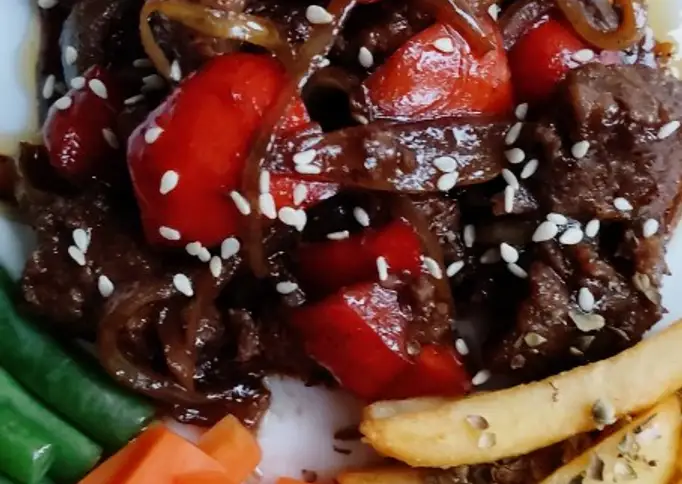 Ambil 500 gram beef wagyu. Gunakan 2 siung bawang bombay. Ambil 1 buah paprika merah. Ambil 133 ml saus tiram instant. Sediakan Secukupnya wortel. Sediakan Secukupnya buncis. Ambil Secukupnya kentang. Siapkan Secukupnya air. Gunakan Secukupnya minyak untuk menggoreng. Gunakan Secukupnya lada hitam. Ambil Secukupnya kaldu bubuk. Siapkan Topping : biji wijen dan oregano.