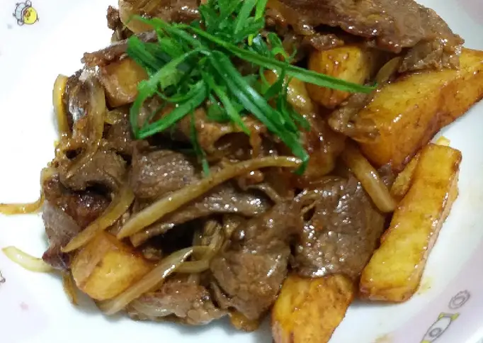 Bumbui daging sapi dengan saos teriyaki biarkan 15menit. Kupas kentang iris agak besar panjang lalu rendam dengan air garam 5 menitan lalu buang airnya dan keringkan dengan tisu dapur. Iris bawang bombai panjang2,lalu panaskan minyak agak banyak goreng kentang sampai matang. Setelah kentang matang,panaskan sedikit minyak lalu tumis daging sapi setengah matang lalu angkat.. Bersihkan wajan lalu panaskan kembali dengan minyak secukupnya untuk menumis bawang bombai tumis sampai harum masukkan daging sapi dan kentang lalu bumbui dengan saus,tumis sebentar jangan lama2 nanti daging menjadi keras.. Setelah daging sekiranya matang matikan kompor lalu taruh masakan dipiring siap dihidangkan..Salah satu hidangan gulai daging yang masih banyak dikenal hingga saat ini adalah hidangan gulai daging sapi. Racikan bumbu dan rasa gurih dari daging menjadi salah satu keunikan yang membuat rasanya sulit dilupakan. Hidangan ini cukup fleksible dan bisa dihidangkan kapan saja. Daging sapi merupakan salah satu pilihan bahan makanan yang cukup digemari di Indonesia. Selain lezat, daging sapi sendiri juga kaya akan manfaat yang Semua daging sapi menawarkan manfaat yang sama.