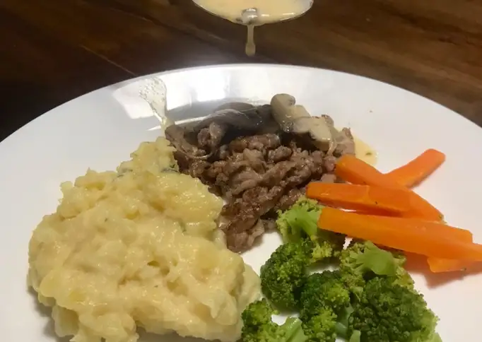 Sediakan 250 g sliced beef teriyaki. Siapkan 1 sdt mentega. Siapkan Garam, lada bubuk, oregano dan steak spice seasoning (Kl ada). Ambil Sayuran. Siapkan 3 pcs wortel. Gunakan 2 pcs Brocoli. Sediakan Mashed potato mushroom sauce. Siapkan Mashed potato (ada di resep attached) (lihat resep).A baked sweet potato stuffed to the brim with mushrooms in a creamy sauce. Just sprinkle with salt and pepper and cook to your taste. Spoon mushroom sauce over I always make the beef reduction and serve it with the caramelized-shallot mashed potatoes. I've used different mushrooms and it always turns out great.