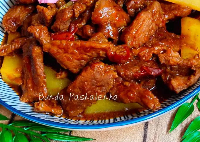 Sediakan 500 gr daging sapi khas dalam, potong-potong. Bersihkan. Gunakan 2 buah tomat potong kasar. Sediakan 5 sdm saus tomat. Ambil 5 sdm Kecap manis. Gunakan 2 sdm margarine untuk menumis. Sediakan 3 buah kentang rebus. Ambil Bumbu halus:. Ambil 6 siung bawang merah. Siapkan 5 siung bawang putih. Gunakan 1/2 buah bawang bombay. Siapkan 1/4 sdt pala. Siapkan 1/2 sdt merica. Siapkan 1/2 sdt garam. Ambil 1/2 sdt kaldu bubuk.