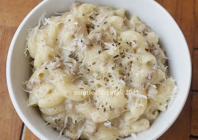 Siapkan 75 gr makaroni kering. Sediakan 75-100 gr daging sapi giling. Ambil 1/4 bawang bombay, cincang. Gunakan 1 siung bawang putih, cincang. Gunakan 1 sdm olive oil. Gunakan 2-3 sdm cooking/dairy whipping cream/susu cair secukupnya. Gunakan Garam, lada, oregano. Ambil secukupnya Keju parut. Siapkan Saya pakai kombinasi natural cheddar + grana padano. Siapkan Kalau pakai cheddar olahan (kraft dll) garamnya dikurangi.