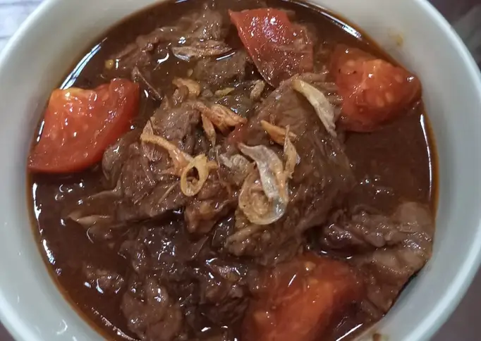 Siapkan 500 grm daging sapi. Siapkan 3 btr bawang putih (geprek u/ rebus daging ny). Gunakan 3 sdm kecap inggris (ini wajib) (me:ganti dg1sdt minyak ikan). Gunakan 2 sdm saus tiram. Siapkan 2 sdm kecap asin (kl gk pke gpp). Siapkan 4 sdm saus cabe. Gunakan 2 sdm saus tomat tambahan saya. Ambil 5 sdm kecap manis. Ambil Secukup ny gula merah(di sisir/ di iris). Sediakan Minyak wijen secukup nya. Ambil 1/2 sdt garam. Sediakan 1 sdm gulaps. Ambil 1 bawang bombay. Sediakan 1 bh tomat segar (tambahan saya). Siapkan Penyedap rasa secukup nya. Ambil Bumbu halus :. Siapkan 8 btr bawang merah. Siapkan 6 btr bawang putih. Sediakan 1 sdt lada hitam(boleh pakai lada putih jg) (me : lada putih). Siapkan 1/4 biji pala. Sediakan Minyak goreng secukup ny untuk menumis.