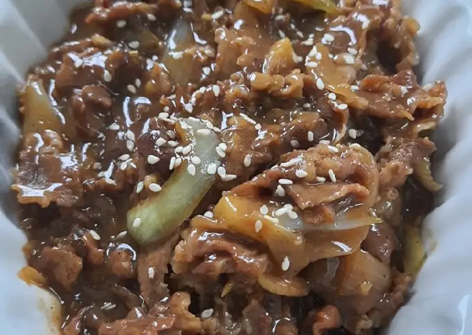 Potong irisan daging (7 bagian). Campur dengan bumbu marinasi, aduk rata. Diamkan dikulkas +-1 jam.. Tumis bawang putih sampai keemasan, masukkan bawang bombay. Lalu masukkan daging slice. Besarkan api. Masak sampai matang, tambahkan air 100ml.. Sesaat sebelum diangkat masukkan sisa bawang bombay. Tambahkan larutan maizena. Aduk rata sampai air sedikit menyusuy dan kental.. Cicipi rasa. Matikan api. Siap disajikan. Scrambel egg : 1 butir telur, 1/4sdt kaldu jamur, lada bubuk, susu uht 15ml, kocok rata.. Kalo suka pedas bisa ditambahkan cabe ya. Ini saya pakai cabe hijau besar 2, cabe rawit 4, tumis diwajan terpisah. Lalu masukkan beef slice yg sudah jd. Aduk rata sebentar..Yakiniku donburi is a Japanese rice bowl dish of sautéed beef and vegetables served over a bed of rice and garnished with sesame seeds. Yakiniku Donburi: Japanese Beef and Vegetable Rice Bowl. BBQ or roast the beef until desired temp. Indonesian style of beef yakiniku is completely different than what other people used to know. It was originally coming from a well known Japanese chain restaurant with the name of Hoka Hoka Bento or.