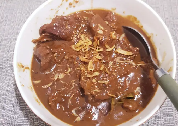 Ambil 1/2 kg daging sapi tanpa lemak. Siapkan 1000 ml air/ secukupnya. Sediakan 1/2 siung bawang bombay iris tipis2. Gunakan Secukupnya kecap manis. Ambil Secukupnya garam. Gunakan 1 sdt kaldu jamur/ sesuai selera. Sediakan 1-2 sdt merica bubuk/ sesuai selera. Sediakan 1 sdt gula pasir/ sesuai selera. Siapkan Secukupnya penyedap rasa/ sesuai selera. Ambil 1/4 sdt pala bubuk/ sesuai selera. Ambil 3 lbr daun salam. Ambil Seruas laos digeprek. Sediakan 1 buah santan kara instan. Gunakan 2 sdm minyak goreng utk menumis. Gunakan Bumbu yang dihaluskan :. Sediakan 3 buah cabe merah keriting. Siapkan 6 buah cabe rawit hijau/ sesuai selera bs d skip. Ambil 8 siung bawang merah. Ambil 4 siung bawang putih. Siapkan 3 buah kemiri. Ambil 1 sdt ketumbar/ sesuai selera.