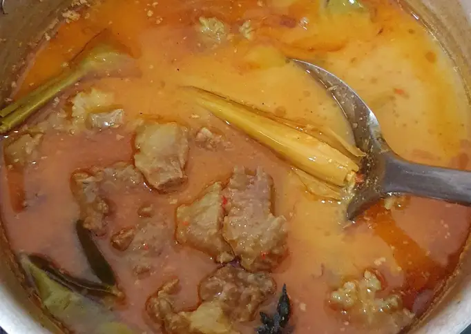 Rebus sebentar daging pada air mendidih (sekitar 5 menit). Buang air rebusannya. Rebus lagi daging dari awal hingga empuk tergantung dagingnya.. Blender bumbu halus. Tumis hingga wangi, masukkan serai, lengkuas, daun jeruk. Tumis bumbu hingga matang.. Masukkan bumbu yang sudah di tumis dan bumbu cemplung lainnya ke dalam panci daging. Biarkan hingga mendidih beberapa saat agar bumbu menyerap ke daging.. Masukkan santan, garam, gula, penyedap, dan tes rasa..